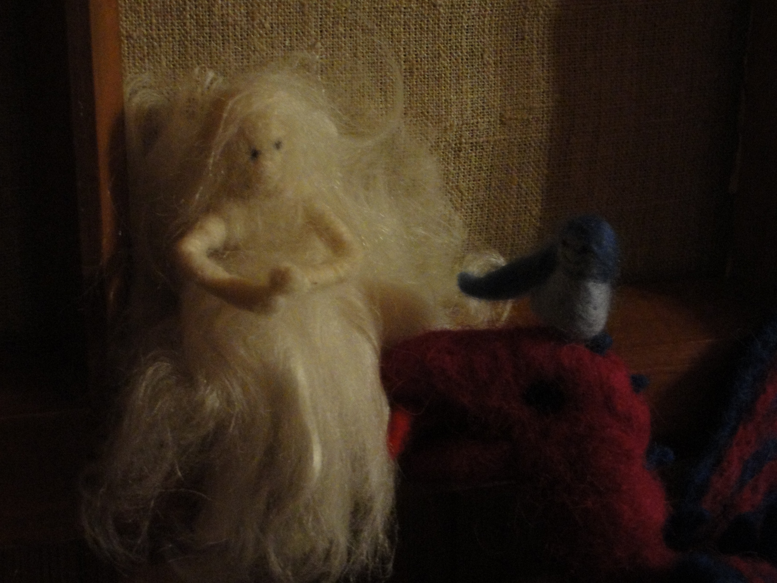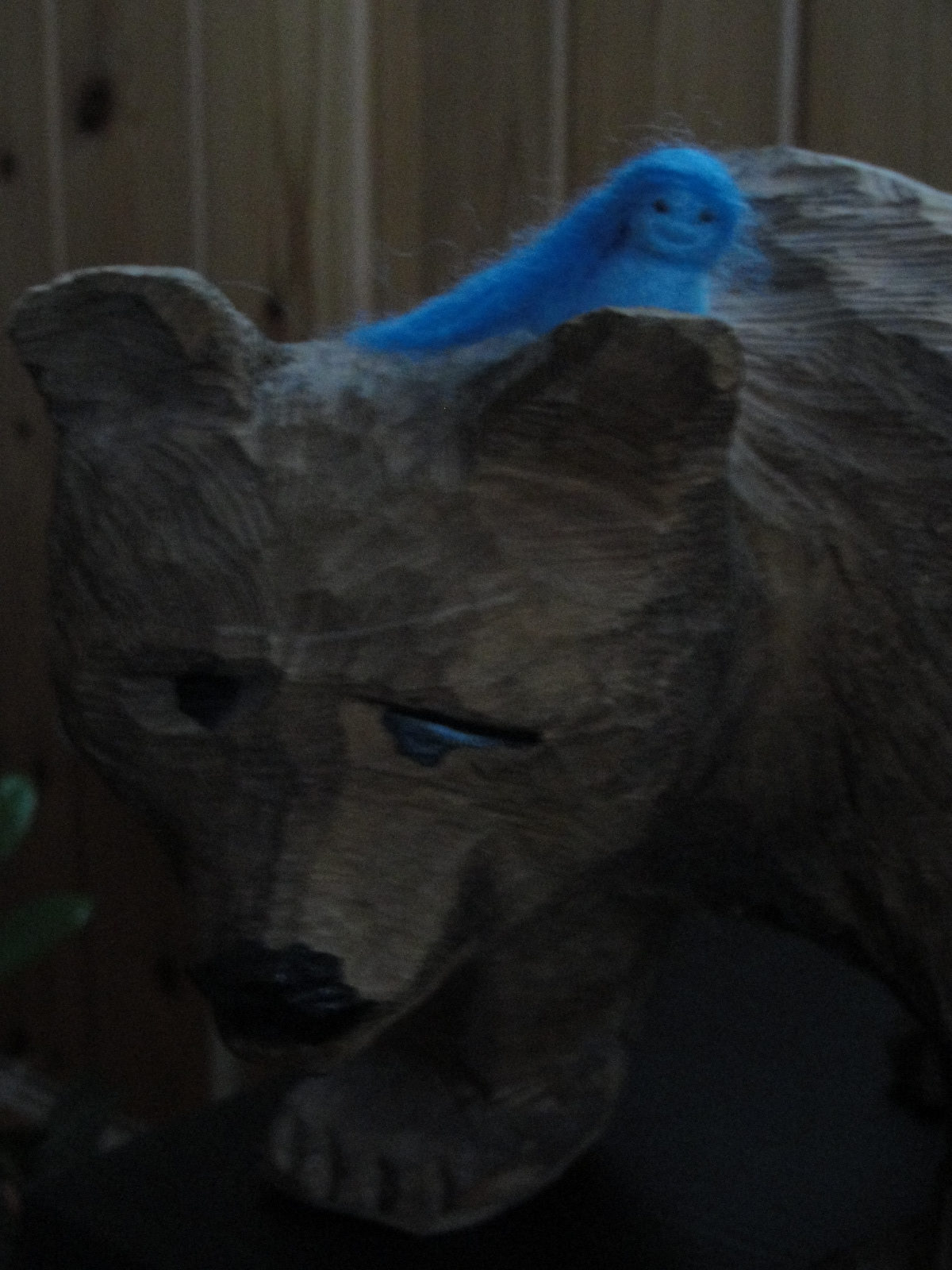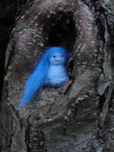 Kätkössä puun kolossa pienen pieni peikko, sininen takkutukka, jalassa villainen