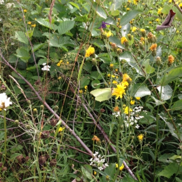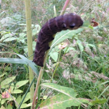 Joinain päivinä kohtaamisia on useita peräjälkeen.Esimerkiksi elokuun ensimmäisenä ollessani kävelemässä ensin maassa möngersi iso toukka paksulainen, laitoin kuvan tyttärelleni, joka kertoi toukan olevan horsmakiitäjä. Toinen samanlainen keikkui niittykasvillisuudessa hetkeä myöhemmin. Seuraava kohtaaminen oli sitruunaperhosen lepattelua sinne tänne iloisesti vilkutellen. Sisilisko livahti aurinkoisella hiekkatiellä yli tien. Loppuhuipennus kävelyllä oli supikoirapesue; kolme pentua ja emo kirmasi huimaa vauhtia kohti metsää. Käteni oli hieman hidas, onneksi ehdin saada kuvan emosta, joka säikähti ja säntäsi toiseen suuntaan. Jatkoin eteenpäin, jotta se löytäisi pentunsa.